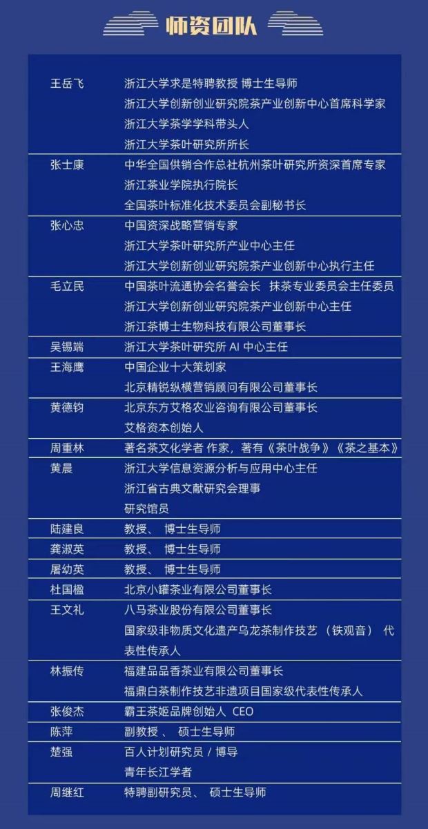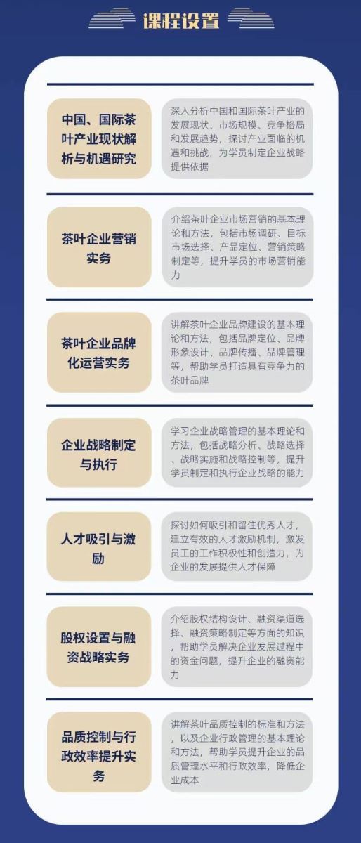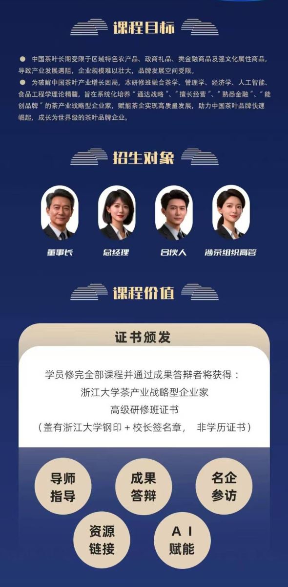 为破解中国茶叶产业增长困局,浙江大学茶产业战略型企业家高级研修班融合茶学、管理学、经济学、人工智能、食品工程学理论精髓,旨在系统化培养“通达战略”、"擅长经营"、”熟悉金融”、"能创品牌"的茶产业战略型企业家,赋能茶企实现高质量发展,助力中国茶叶品牌快速崛起,成长为世界级的茶叶品牌企业。