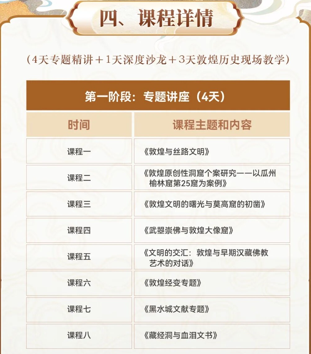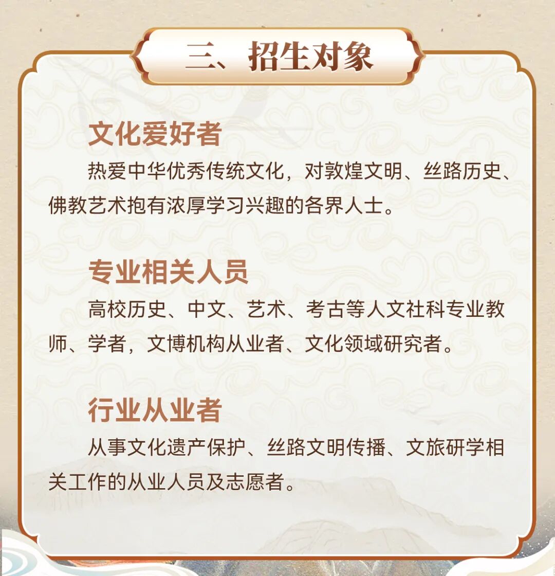 2.费用包含:专家授课费、现场教学费(含特窟费用)、敦煌本地交通费、课程资料费、学杂费等;