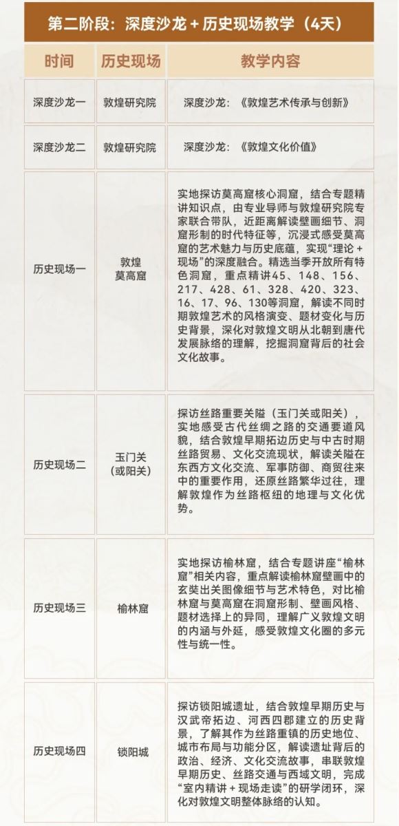 现场教学:敦煌历史现场,包括:敦煌研究院莫高窟、榆林窟、玉门关(或阳关)、锁阳城。