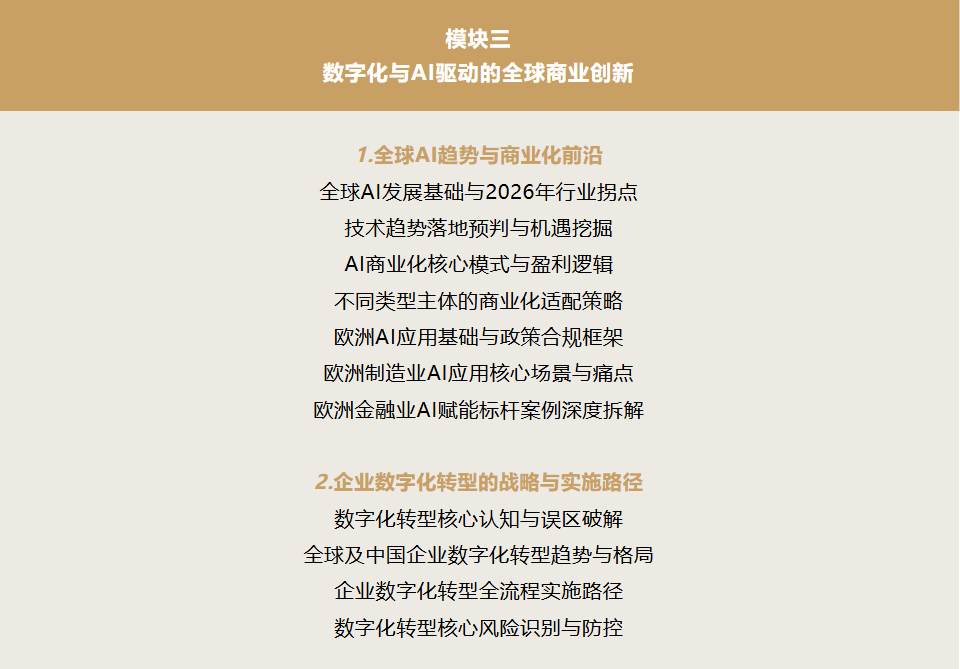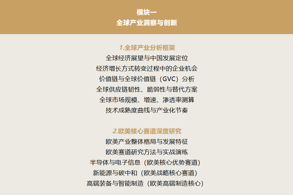 中国制造正经历从产品出口向全球价值链整合的关键跃迁。面对地缘政治波动、ESG合规压力、欧洲市场技术壁垒等复杂挑战,企业不再需要泛泛的知识输入,而急需一张通往全球价值链顶端的"航海图"。本项目应势而生,专为处于产能、产品、技术、品牌跨越期的中国领军企业家定制,助力其在国际深水区建立稳固根据地。