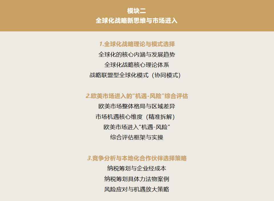 ◆ 实战交付每位学员在导师指导下完成《企业全球化落地路线图》,将战略转化为可执行的行动方案。