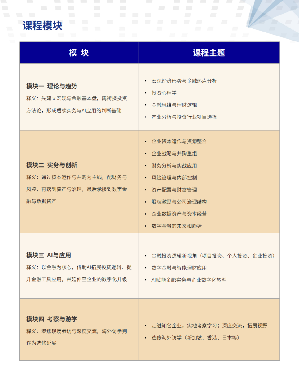 浙江大学金融投资实战运营高级研修班,依托浙江大学专业权威与业界资源,凝练19年商学教育经验、万名校友积累。通过金融和创新的双轮驱动,全新引入互动式、项目制教学模式,助力企业家提升全局视野,搭建思维框架,分享金融界高端人脉,聚变式地创造企业价值,使企业家的财富得到有序的增长和传承,在面对国际化竞争中,能够基业长青。