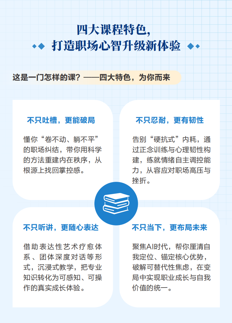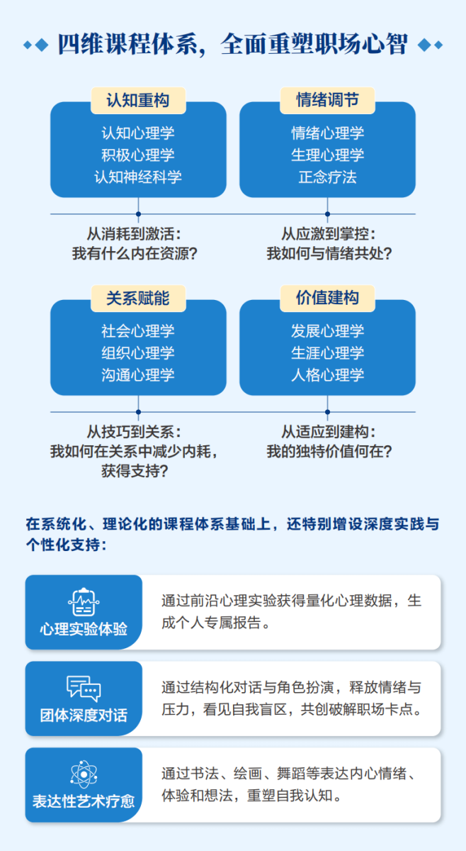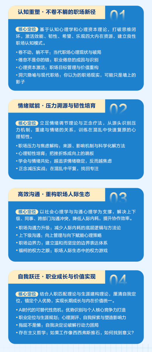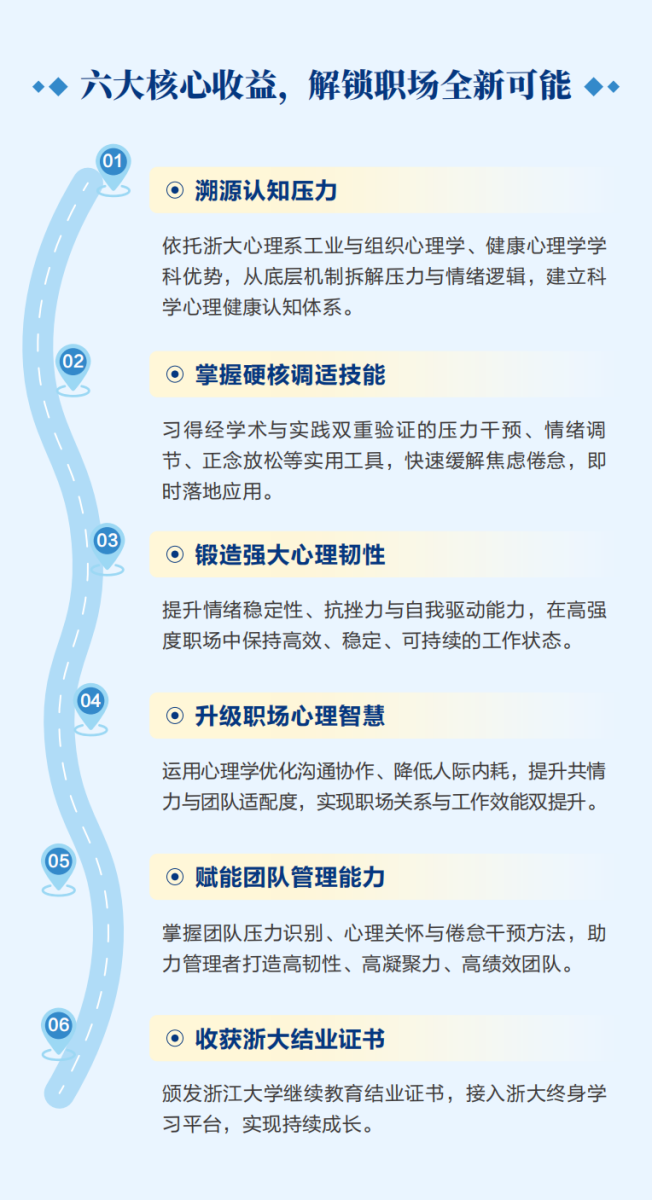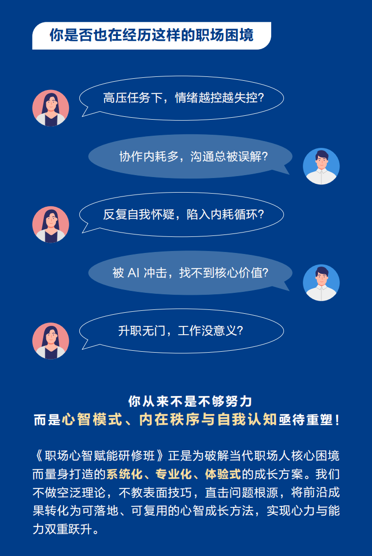 浙江大学职场心智赋能研修班正是为破解当代职场人核心困境而量身打造的系统化、专业化、体验式的成长方案。我们不做空泛理论,不教表面技巧,直击问题根源,将前沿成果转化为可落地、可复用的心智成长方法,实现心力与能力双重跃升。