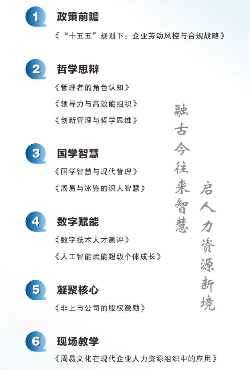 帮助人力资源从业者在数智浪潮与人文精神交织的时代背景下,突破传统管理思维,在通过系统学习的同时深度融入国学智慧与哲学思维,全面提升学员的人文素养与底蕴,探索构建高度人文力的中国特色现代人力资源管理体系,为人力资源行业高质量发展培育德才兼备的战略性人才。
