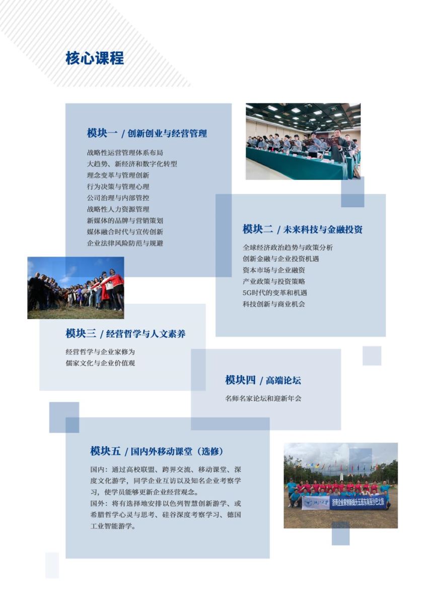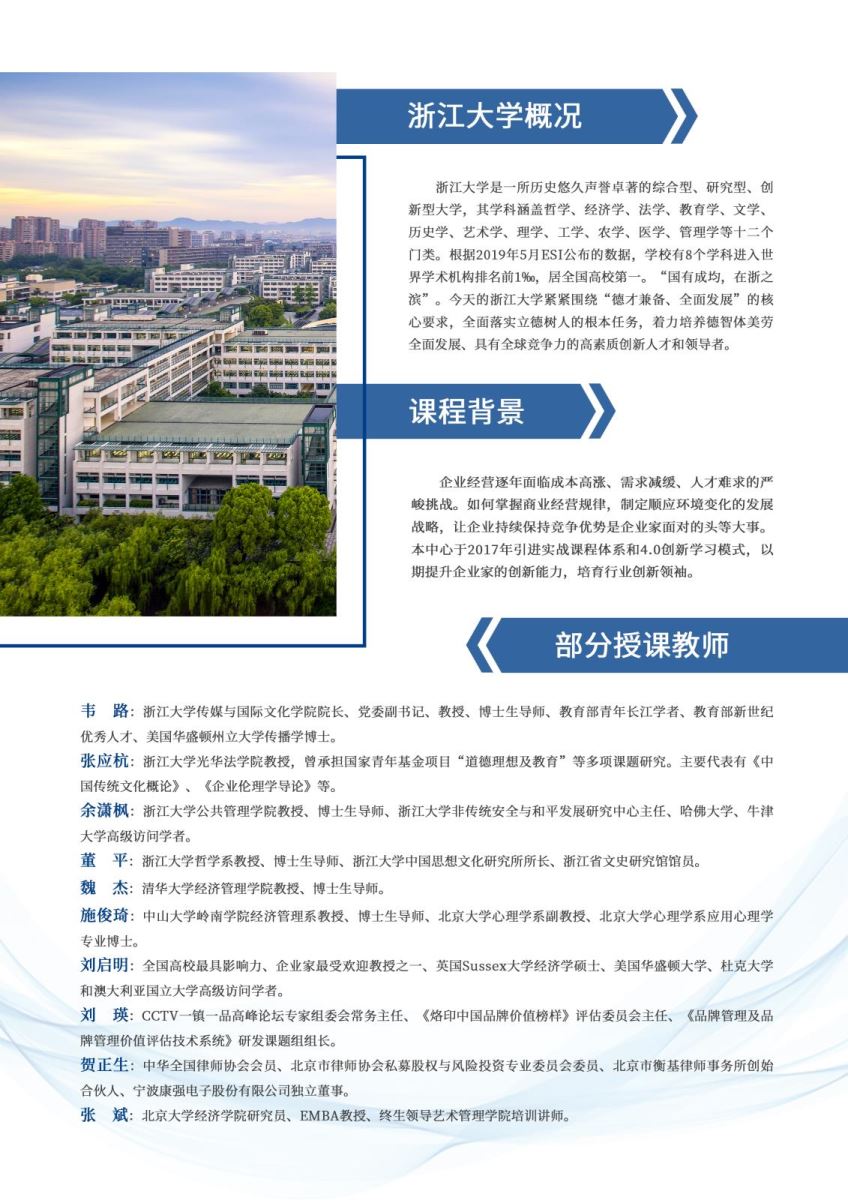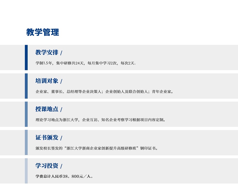 企业经营逐年面临成本高涨、需求减缓、人才难求的严峻挑战。如何掌握商业经营规律,制定顺应环境变化的发展战略,让企业持续保持竞争优势是企业家面对的头等大事。浙江大学浙商企业家创新提升高级研修班于2017年引进实战课程体系和4.0创新学习模式,以期提升企业家的创新能力,培育行业创新领袖。