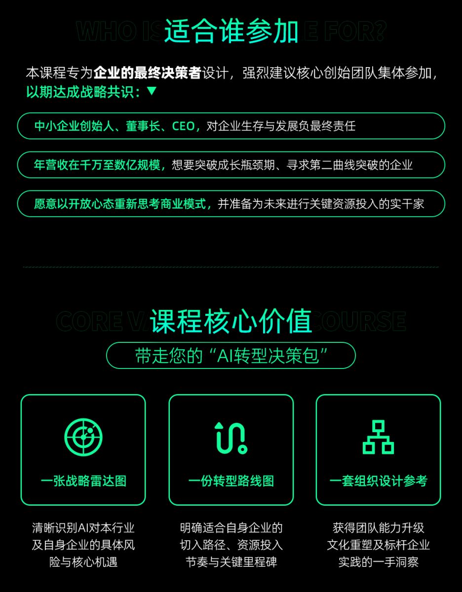 企业创始人、董事长、CEO等核心决策者,负责企业战略、数字化转型的高管,想要布局AI赛道、寻求业务创新的创业者