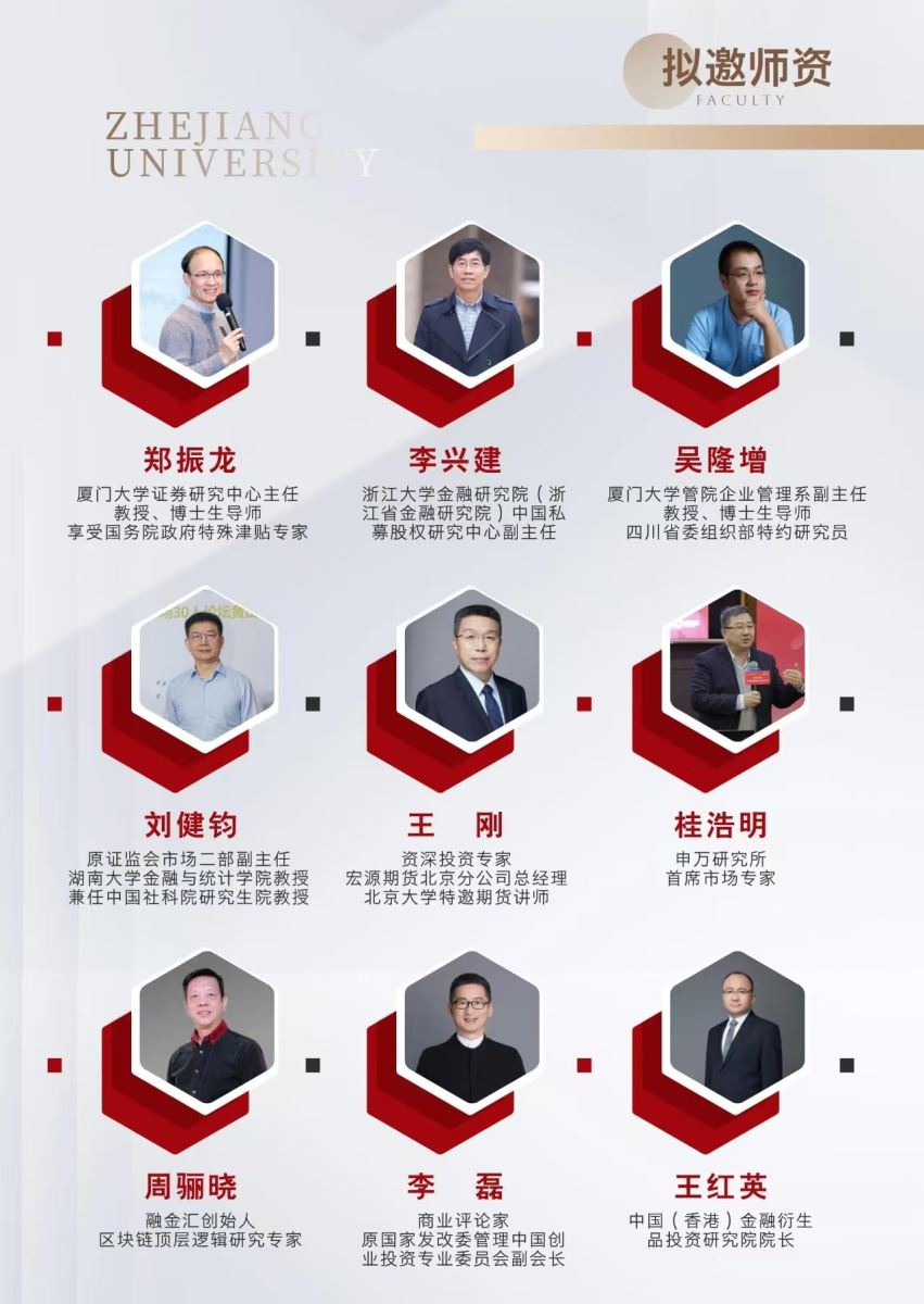 浙江大学金融投资与资本运作高级研修班,旨在培养一批具有全球视野、战略眼光以及资本市场实践能力的金融人才,帮助运筹帷幄寻求突破的中国企业管理者了解资本市场大环境,储备资本运营知识启迪智慧,通过整合浙江大学在金融、经济、管理等多学科领域的优势资源,结合国内外金融市场的最新动态和实践经验,帮助学员把握金融投资的核心原理和资本运作的关键策略,提升其在复杂金融环境中的决策能力和风险管理水平,为企业的发展注入新的活力,推动中国金融市场的健康发展和经济的转型升级,达到资本与企业高度融合,从而实现由产品经营到资本运营的突破性,通过高效的资本运营和管理推动企业健康高速发展。