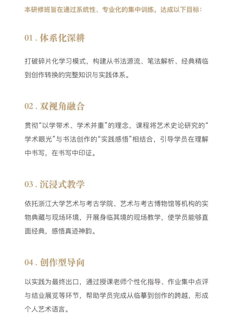 2019年的5月,浙江大学整合优势资源,正式成立艺术与考古学院。学院以“4系+1馆”为核心架构,即考古与文博系、艺术史系、美术系、设计艺术系四个学系和艺术与考古博物馆,致力于建设具有“中国特色、一流水平”的艺术与考古学院。学院依托强大师资队伍、完备的人才培养体系及丰富的教学资源,为高层次书法艺术人才的培养提供了顶尖平台。