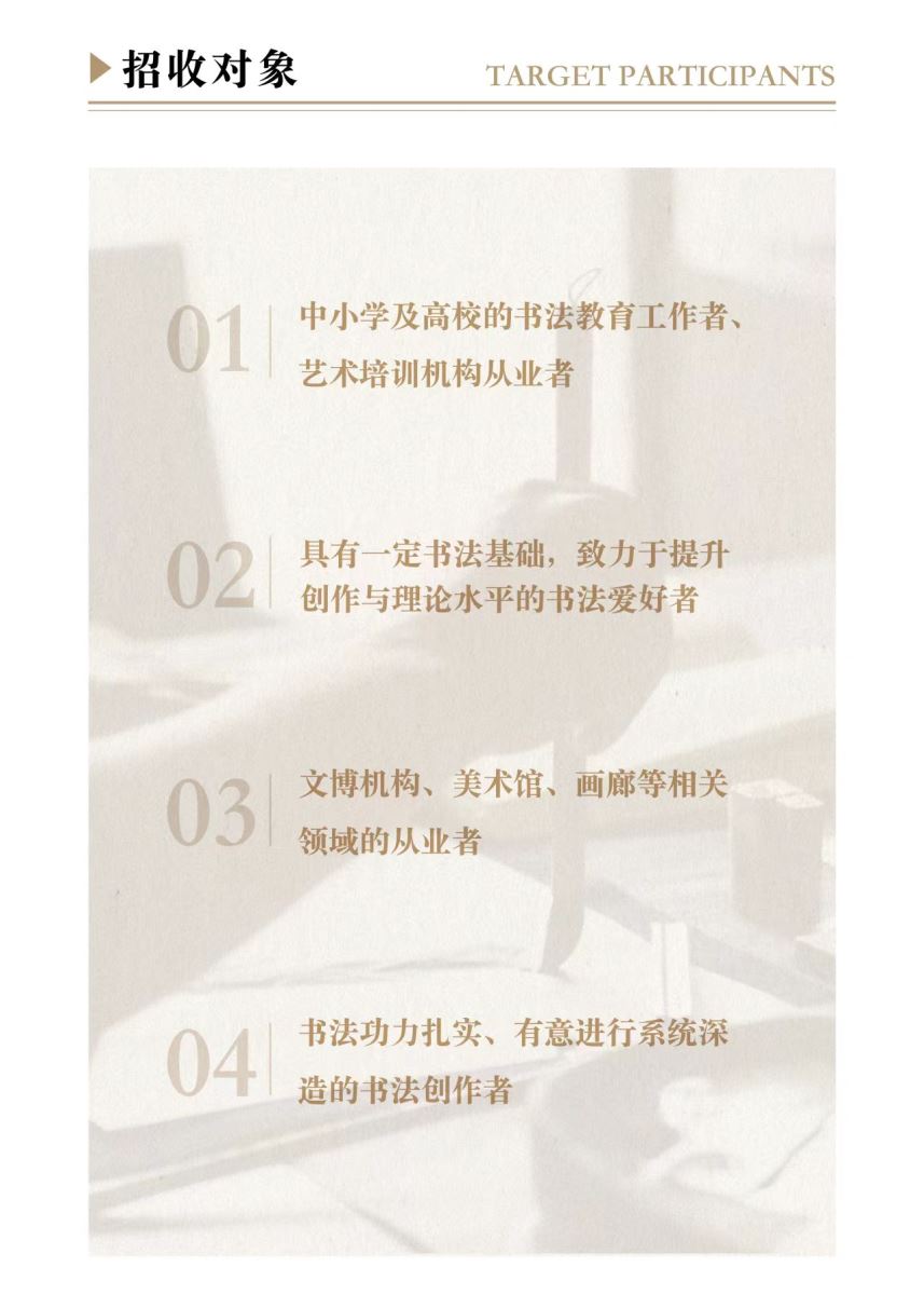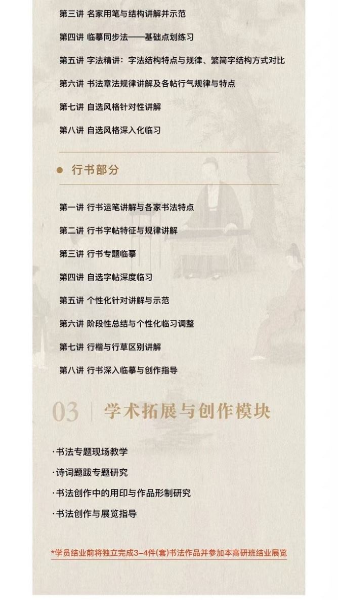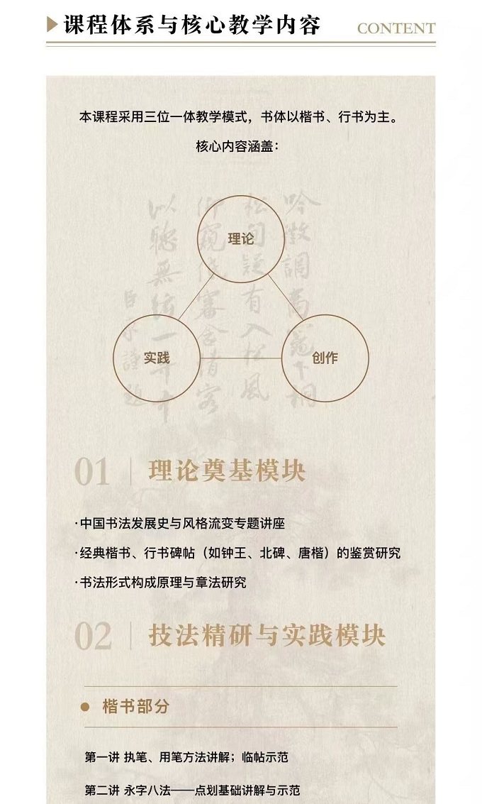 为深挖中国书法艺术内涵,培养兼具传统功底与当代视野的书法创作与研究人才,学院特开设“书法实践高级研修班”。本项目将聚焦“书法”这一课程核心,通过系统化的理论讲授、沉浸式的技法训练与多元化的学术指导,引领学员步入书法艺术的殿堂。