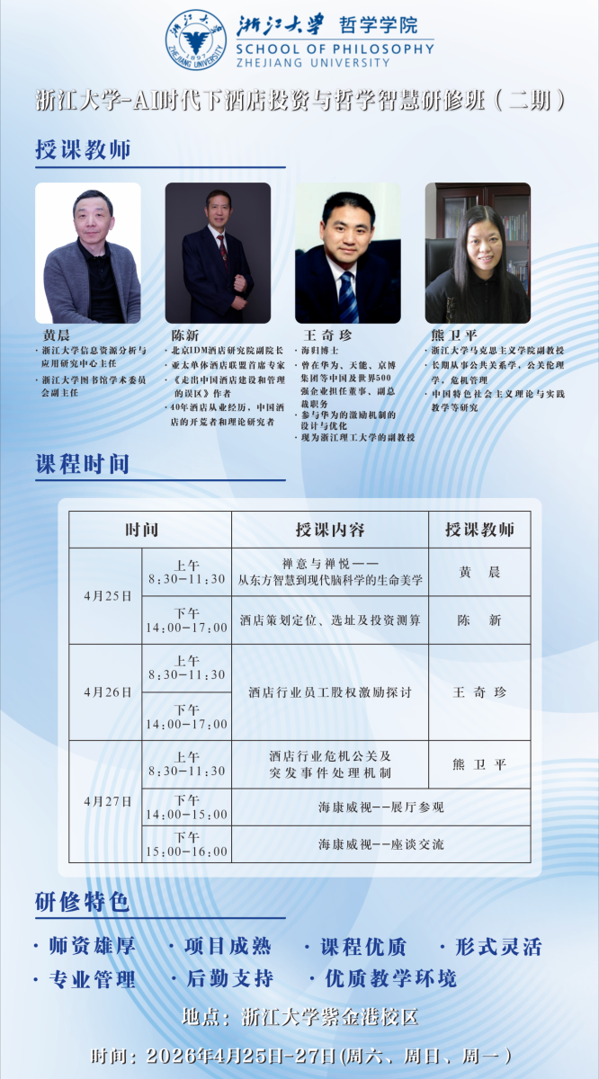3、证书颁发:学员按计划完成研修过程,通过考核,将获得浙江大学颁发的“浙江大学-AI时代下酒店投资与哲学智慧研修班”继续教育结业证书。