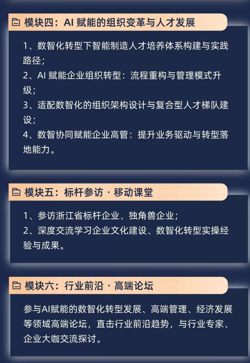 本课程为所有正在转型和准备转型的企业管理者们量身特设,从战略引领、核心技术与落地实践、AI业务新模式、组织变革与人才发展四个模块全面讲解数 智化转型精髓,解决难题。课程体系完整实用,是广大企业家学习提高企业数智化转型能力提升的最核心项目。同时,高研班获智能制造城市发展联盟及杭、甬、苏、嘉、锡、常、绍、衢、湖、连、青多地智能制造相关行业协会智力支持,共擎行业发展大旗,倾力将本项目打造为中国制造业数智化转型领域教育培训与研习交流的标杆品牌,以协同之力赋能制造业数智化转型高质量发展。