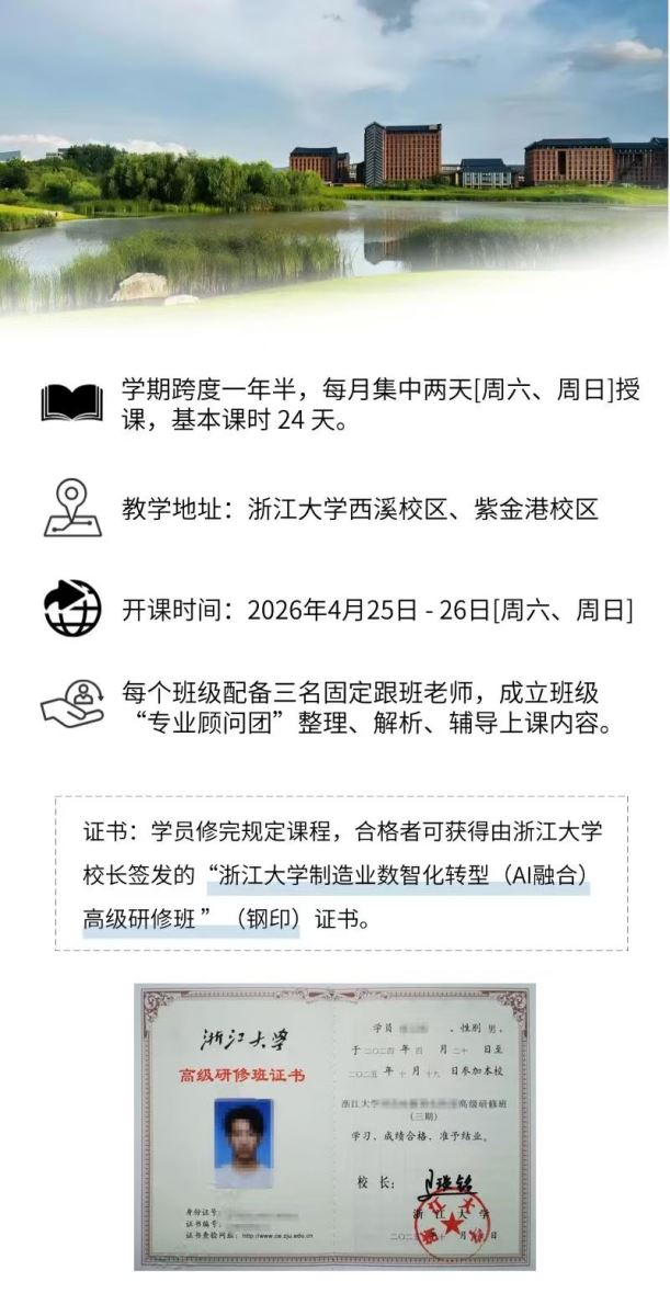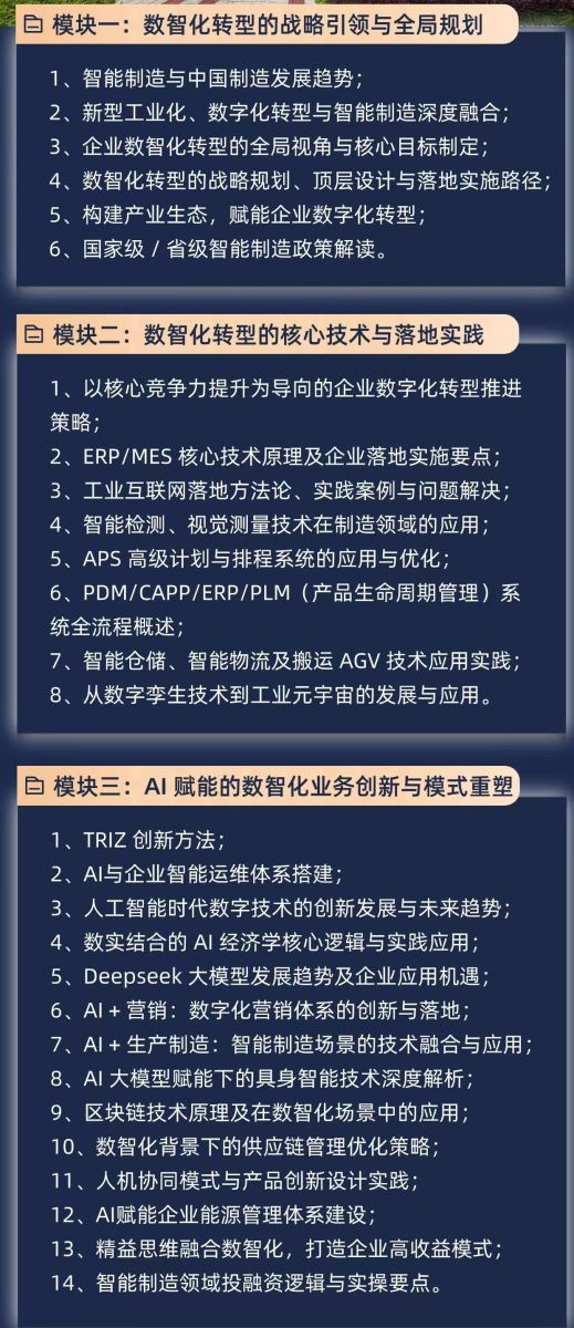立足“十五五”发展新起点,全球制造业数字化转型浪潮奔涌,国家明确以数智赋能打造制造强省强市,前瞻布局具身智能等未来产业,以 “产业大脑+未来工厂”推动产业链融合升级。制造业数智化转型成为培育新质生产力的核心抓手,企业亟需借助AI融合实现全链路升级,抢抓产业发展新机遇。中国制造业虽进步显著,但整体水平仍有提升空间,且各行业转型情况参差不齐。为帮助企业在新的竞争格局中脱颖而出,特开设制造业数智化转型(AI融合)高级研修班。该研修班为所有正在转型和准备转型的企业管理者们量身特设, 紧密围绕AI重塑制造全链路、数字孪生、边缘计算、绿色制造、协同创新生态、人机协作、供应链等前沿技术话题,助力企业突破发展瓶颈,实现技术创新与产业升级的深度结合。课程体系完整实用,是广大企业家学习提高数智化转型能力提升的最核心项目。