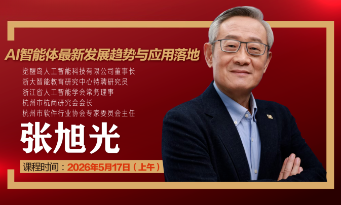 授课老师:张旭光,觉醒岛人工智能科技有限公司董事长、浙大智能教育研究中心特聘研究员、浙江省人工智能学会常务理事、杭州市杭商研究会会长、杭州市软件行业协会专家委员会主任。