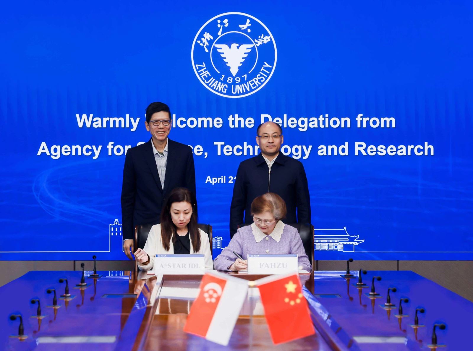 4月21日,浙江大学校长马琰铭院士会见新加坡科技研究局(Agency for Science, Technology and Research,简称A*STAR)主席陈祝全(Tan Chorh Chuan)一行,就创新创业及成果转化开展交流,并共同见证浙江大学医学院附属第一医院与A*STAR传染病研究院(Infectious Diseases Labs)共同签署联合实验室协议,推进中国—新加坡传染病防治与药物研发“一带一路”联合实验室建设。