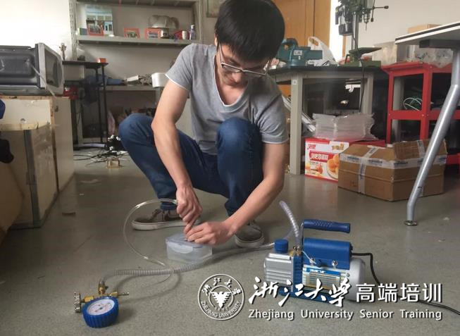 这就要推出这支团队的“元老”成员们。最初的团队是由能源工程学院2013级本科生刘柏辰带领的五人团队。为备战2016年的全国大学生节能减排社会实践与科技竞赛,团队在头脑风暴数周后,想出一个点子:超声波具有很强的能量和穿透力,已普遍用于清洗;既然有真空印染技术,那么是否也可以利用真空去污,和超声波清洗结合,从而增强洗涤效果?
