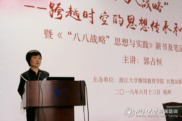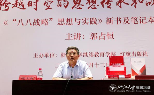 发布日期:2018-06-14 点击次数:587次在全党全社会学习宣传贯彻党的十九大精神和习近平新时代中国特色社会主义思想之际,6月13日下午,浙江省委政研室原正厅级副主任郭占恒走进浙江大学继续教育大讲堂,以《跨越时空的思想传承和战略谋局》为题,为继续教育学院干部、职工作了“八八战略”专题报告。报告会由继续教育学院党委书记兼全国干部教育培训浙江大学基地常务副主任童晓明主持。