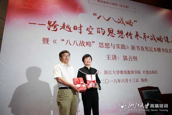 报告会上,红旗出版社总编辑徐澜介绍了郭占恒新著《“八八战略”思想与实践》出版情况,并向浙江大学继续教育学院赠送了该书及《践行“八八战略”建设“六个浙江”学习笔记》,继续教育学院院长兼全国干部教育培训浙江大学基地副主任楼锡锦代表学院接受赠书。
