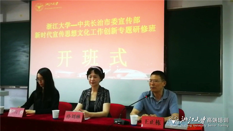 2018-07浙大培训动态:5月29日,长治市委宣传部主办的“新时代宣传思想文化工作创新”专题研修班在浙江大学举行开班仪式。长治市委常委、宣传部部长孙刘琳,浙江大学继续教育学院副院长王正栋出席开班式并作动员讲话。