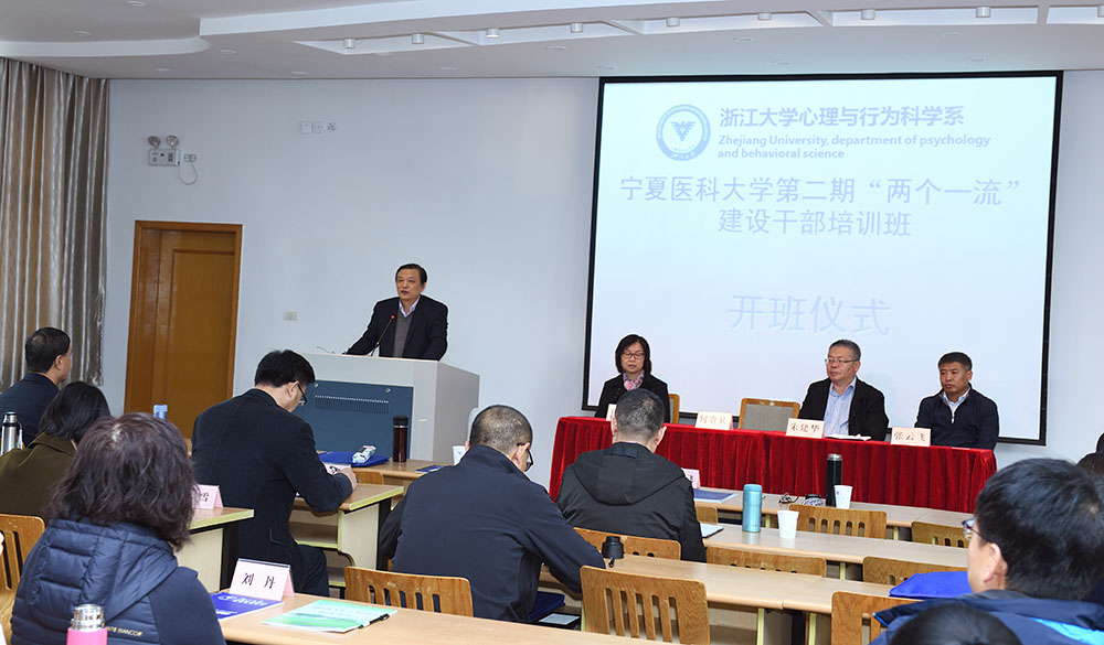 浙江大学培训快讯:2018年11月21日,为其一周的“宁夏医科大学第二期“两个一流”建设干部培训班”在浙江大学西溪校区心理系413教室热烈开班。开班仪式上,浙江大学心理与行为科学学院院长何贵兵教授致欢迎辞,向在场的32名骨干教师学员介绍了浙江大学的历史、现状与未来发展,介绍了心理与行为科学学院的办学特色与学科特点;宁夏医科大学校党委副书记朱建华副教授致辞,感谢浙江大学心理与行为科学学院对本次培训的支持与周到安排,同时对参加本次培训的全体骨干教师提出了具体的学习要求与目标。